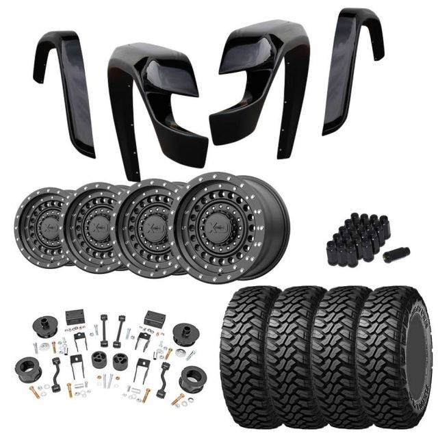 2.5インチのリフトアップと大人気KMCホイールとオフロードタイヤ、ホイールを収める50ミリワイドフェンダー、ナットがセットされたパッケージです!